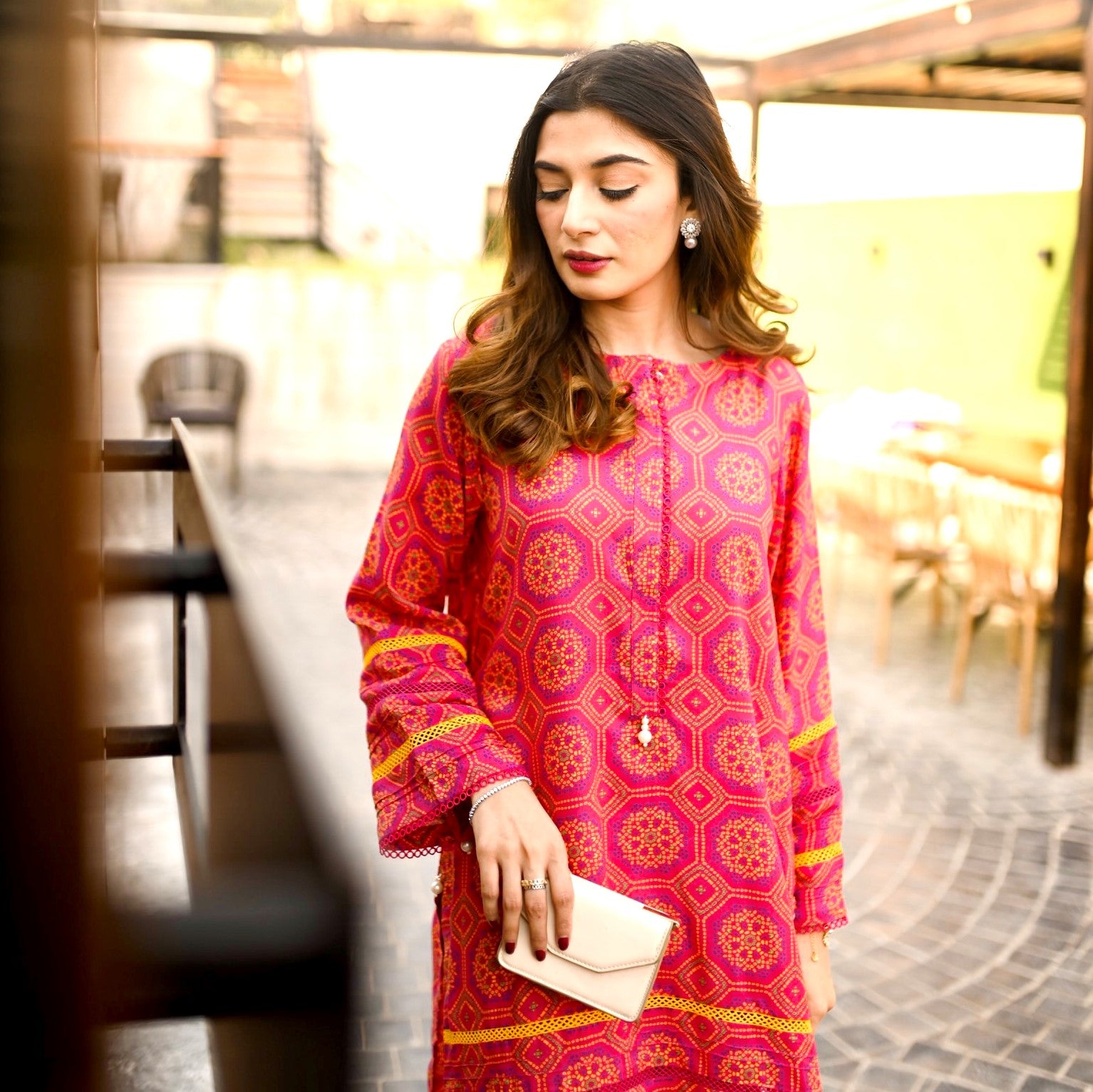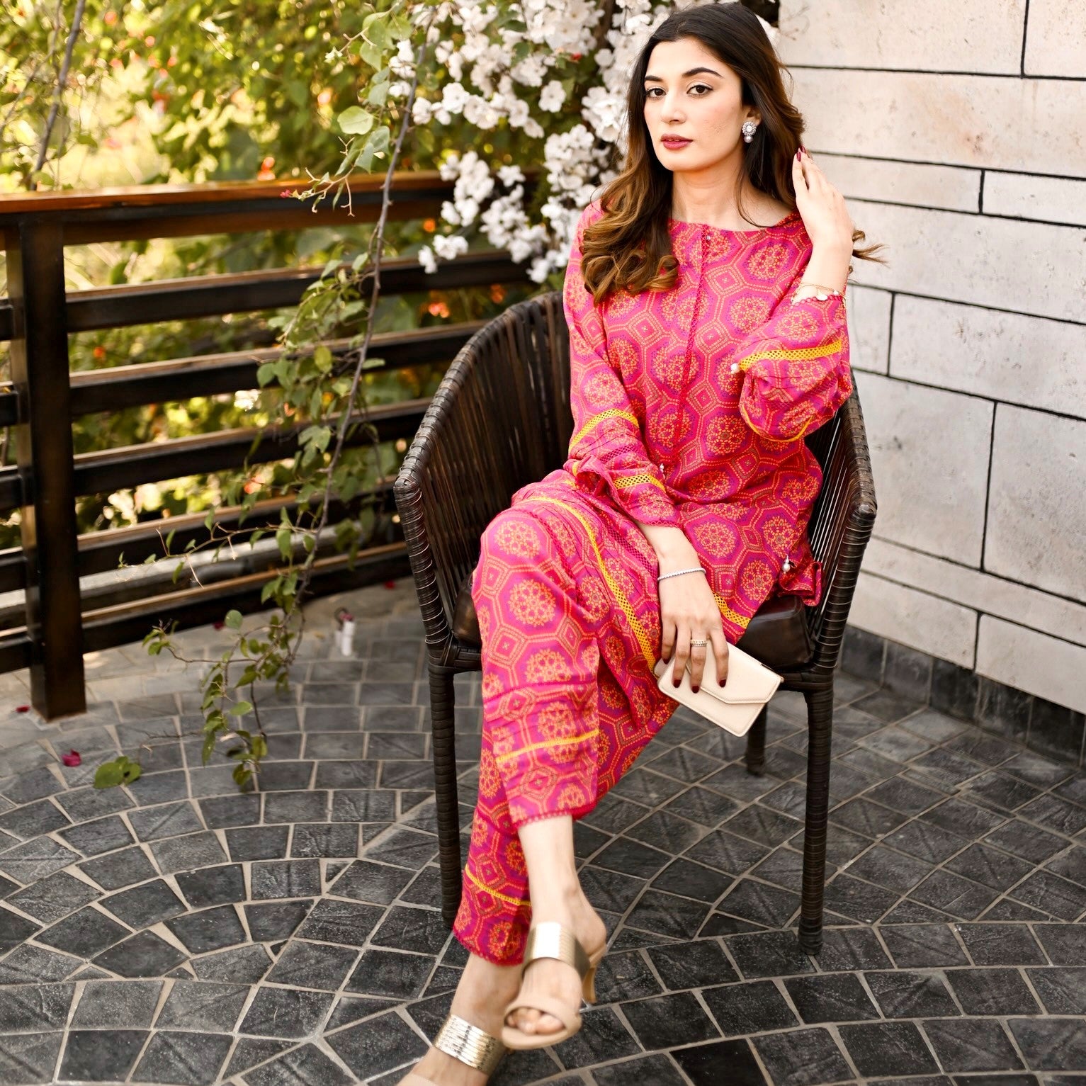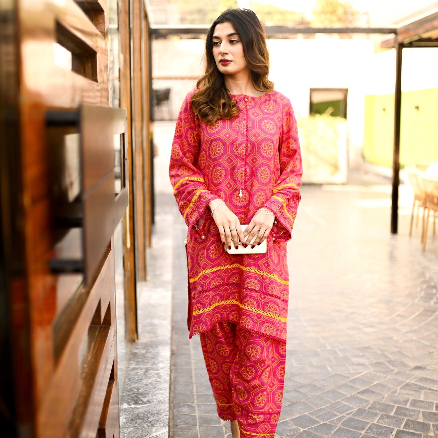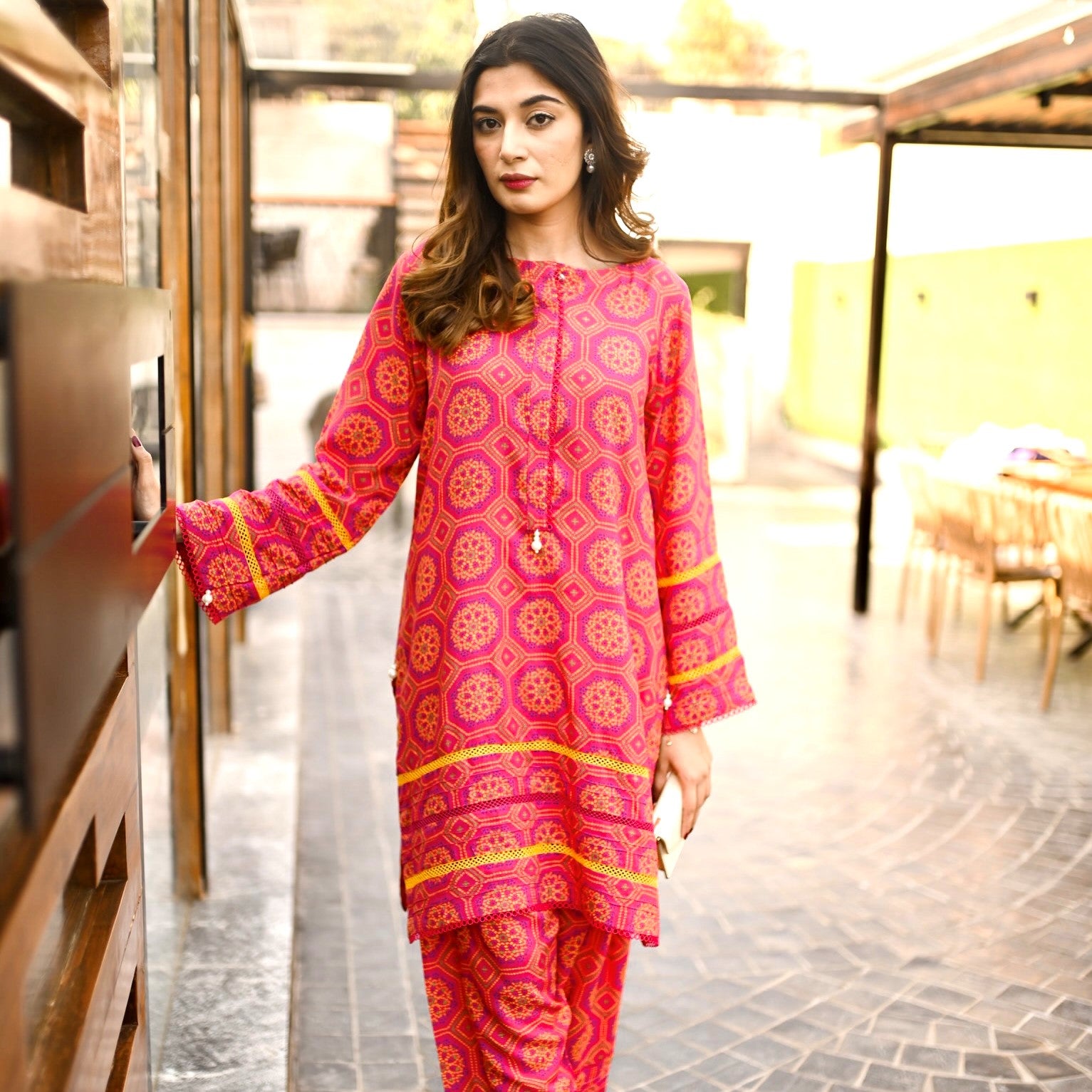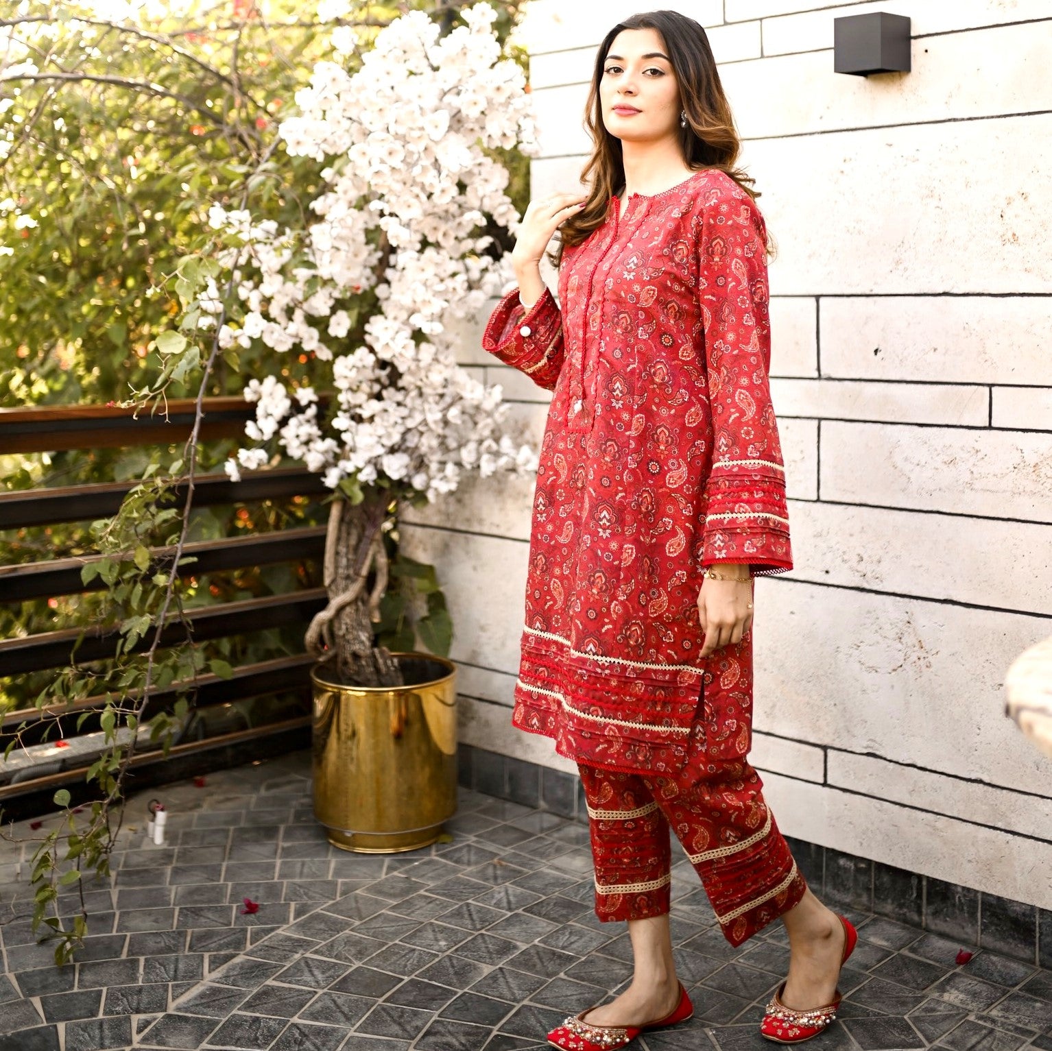 An elegant printed cords designed in a chic silhouette shirt with graceful laces and pearl detailing on neckline and sleeves paired with straight shalwar.