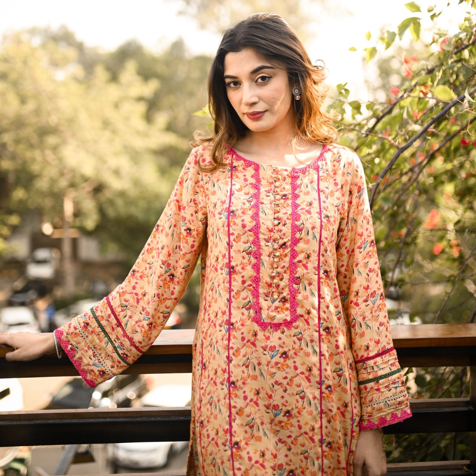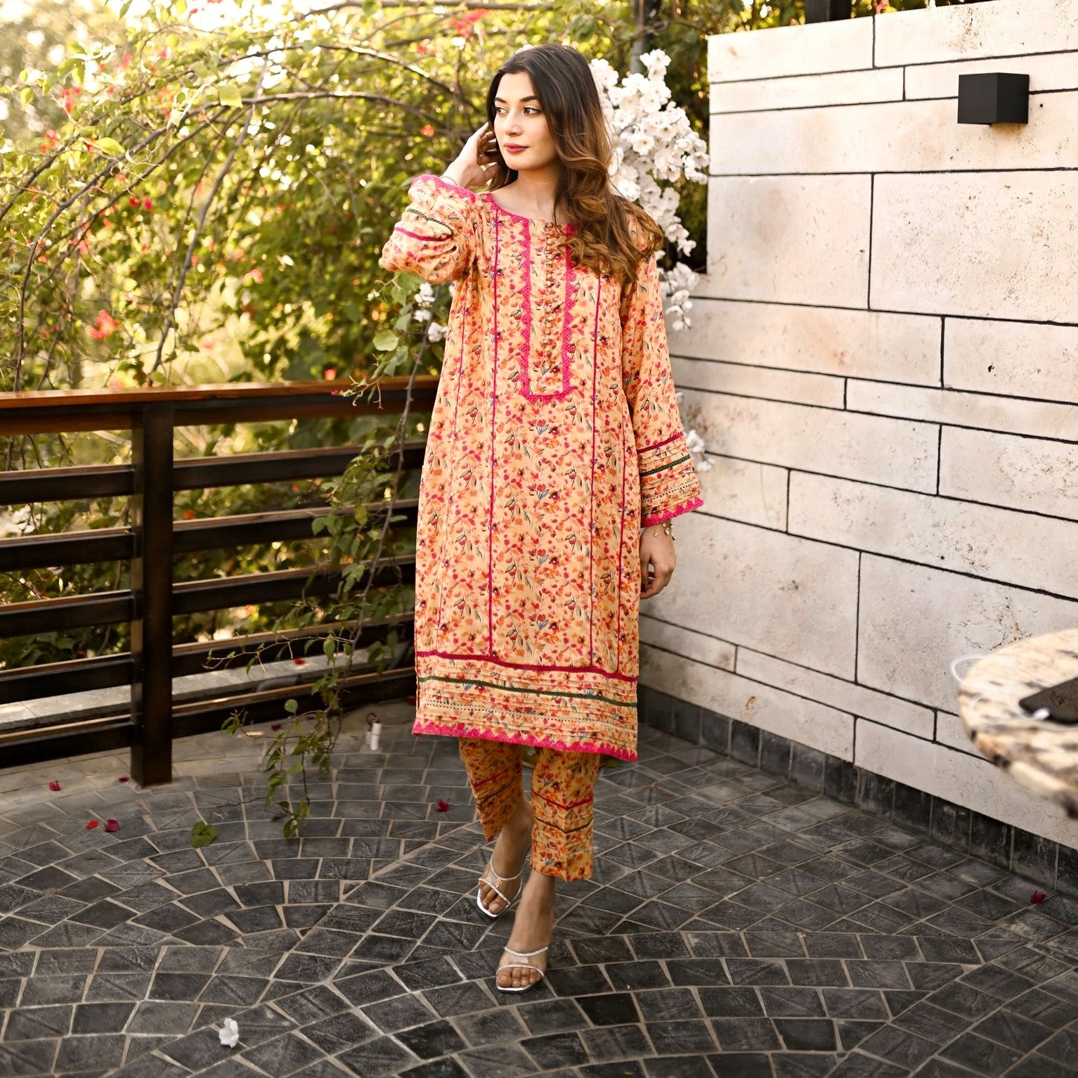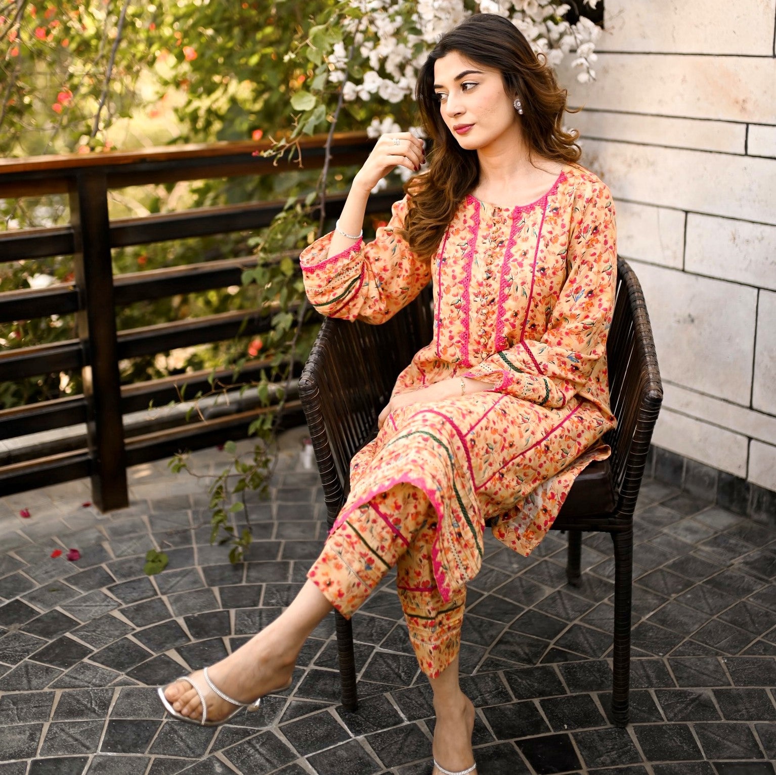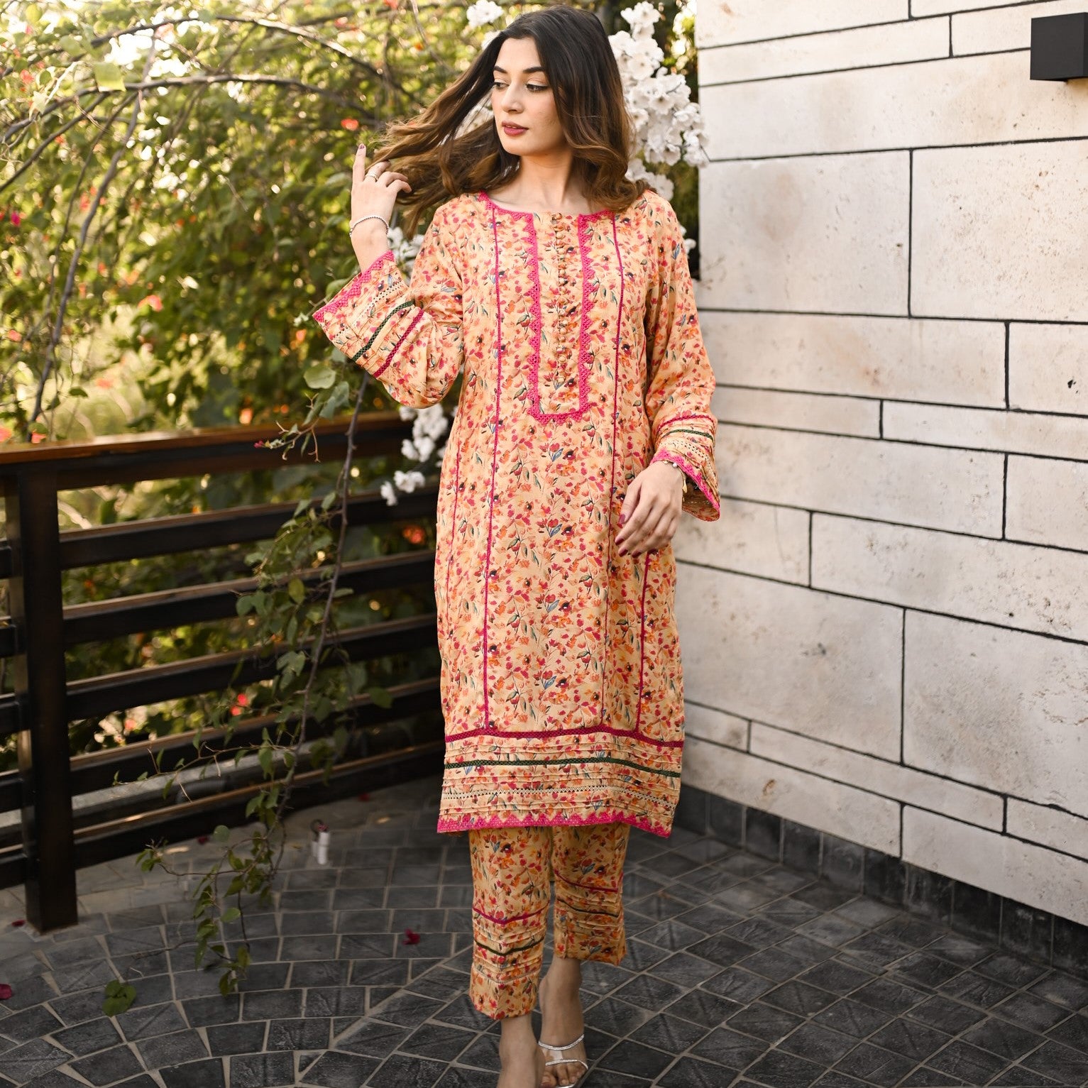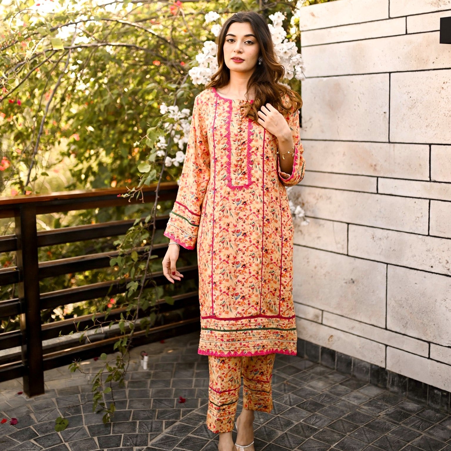 Graceful printed cords designed in a chic silhouette shirt with laces and pearl detailing on neckline and sleeves paired with straight pants.