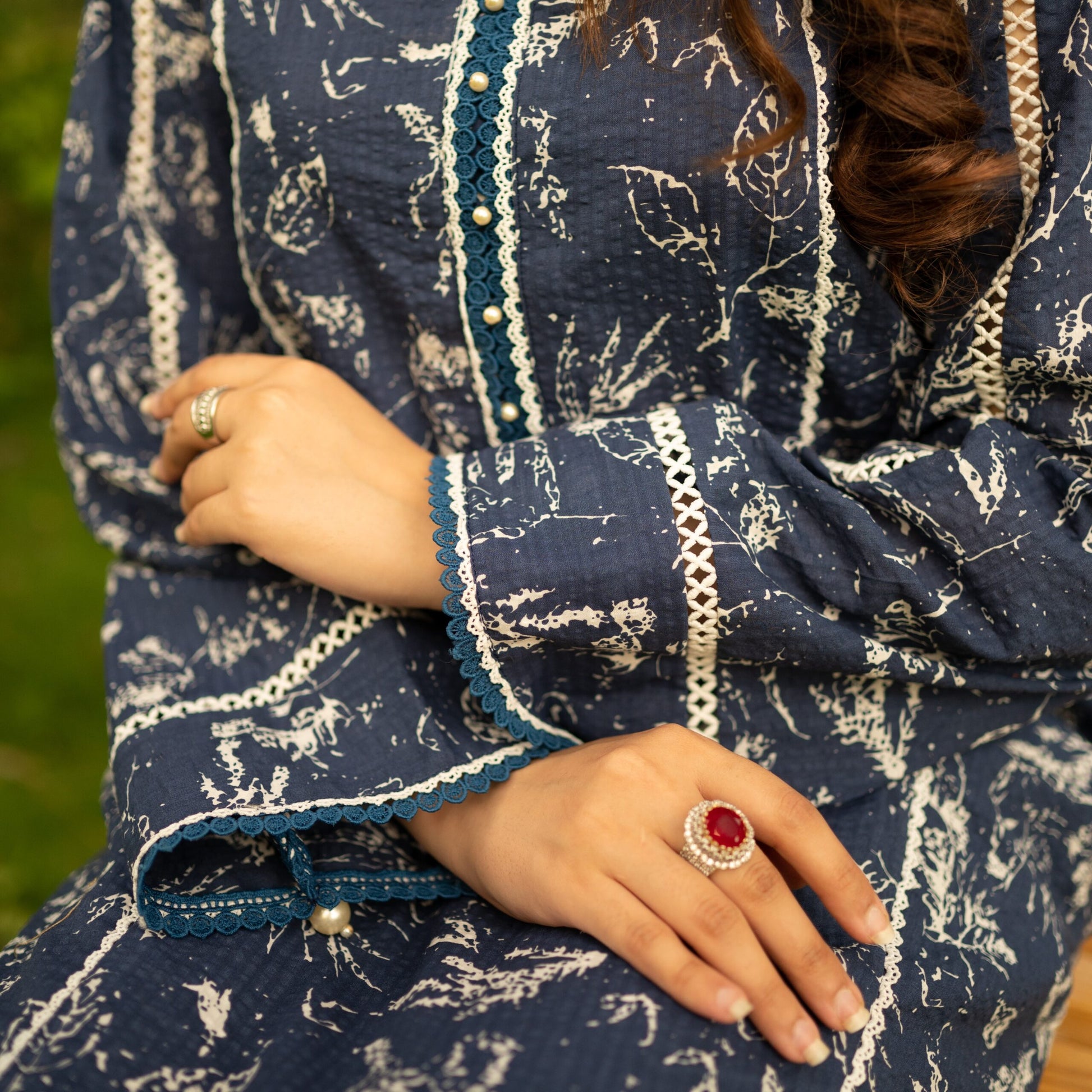 An elegant printed shirt with side panels beautifully adorned with floral embroidery at the front with laces and pearl detailing on the neck and sleeves along with straight-fit pants.